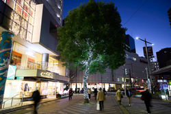 この演出の美しさは、一切の余計な色彩を排し、白一色の「純度」を極めた点にあります。フェンスや低木に沿って流れる光のラインもすべてホワイトで統一され、都会のコンクリート造形を凛とした気品で包み込んでいます。華やかさの中にどこか背筋が伸びるような潔さを感じさせる、洗練を極めたイルミネーションです。