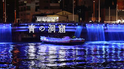 この演出の真髄は、光の滝が水面に鏡のように映り込み、現実の輝きと水面の揺らぎが一体となって圧倒的な没入感を生み出している点にあります。水辺を縁取るように敷き詰められた高密度の青い光は、遠くから見るとまるで「蒼の洞窟」へと続く道標のよう。都会の夜景を借景としながらも、その場所だけが異世界のような静謐さと華やかさを放つ、ダイナミックな水辺の演出です。