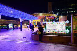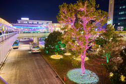 その足元には、色とりどりの花々を模したモチーフライトが咲き誇り、幻想的な「光の花園」を形成。周囲の生垣には鮮やかなグリーンの光が敷き詰められ、都会的な構造美の中に、温もりある自然の息吹を感じさせます。上空の黄金色と足元の彩り豊かな光が調和し、行き交う人々の足を止めて心に灯をともす、遊び心と品格に満ちた空間デザインです。