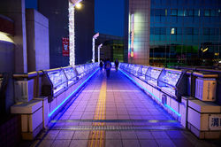 駅前の開放的なデッキを舞台に、円形構造を活かしたダイナミックな光の演出が目を引きます。頭上を彩るのは、幾重にも重なるシャンパンゴールドの光の輪。まるで夜空に巨大な王冠が浮かび上がったかのような圧倒的な存在感を放ち、円柱を伝い落ちる光の粒が空間に華やかさを添えています。