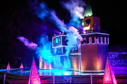 エントランスでまず目を引くのは、水面に浮かぶイルミネーション。青や紫、ピンクへと色彩を変える光の帯が噴水のしぶきと溶け合い、霧とレーザーが織りなすダイナミックなショーが訪れる人々を一気に非日常の世界へと引き込みます。森の奥へと続く散策路には、温かなシャンパンゴールドの光が降り注ぎ、夜の紅葉を鮮やかに浮かび上がらせます。カエデの葉が光を透かし、頭上を埋め尽くす光景は、まるで黄金のトンネルを歩いているかのようです。